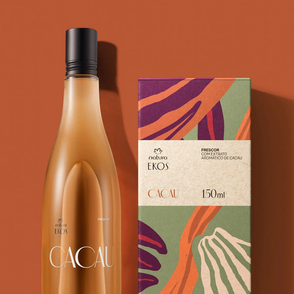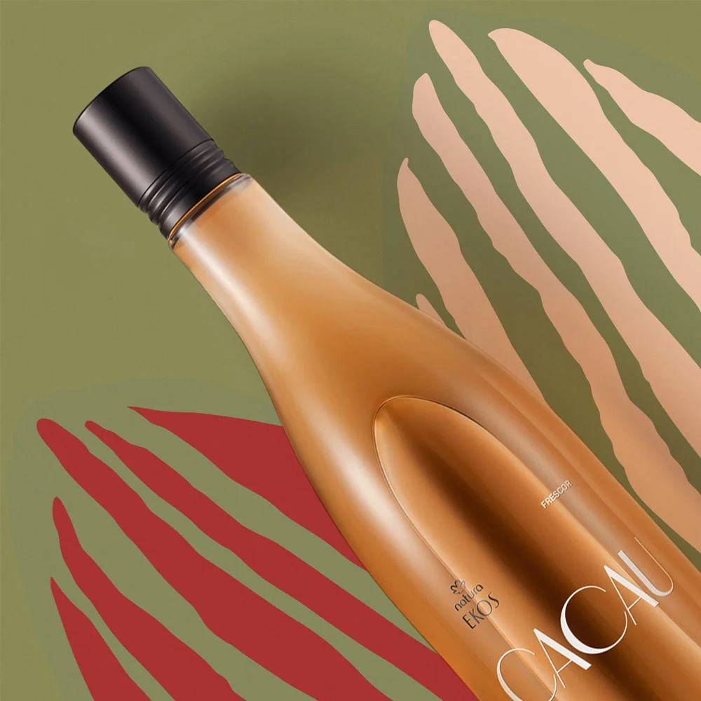 Fragancia fresca y cremosa de cacao amazónico, presentada en un frasco alargado de vidrio oscuro con tapa negra. Ideal para uso diario con aroma suave cítrico y dulce.