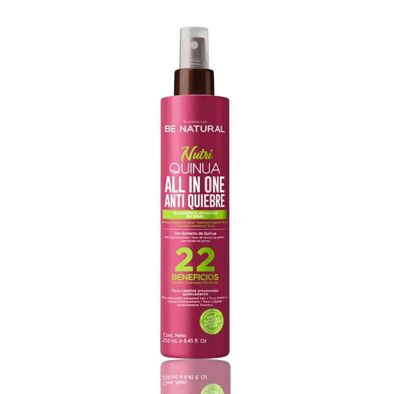Spray tratamiento intensivo con fórmula enriquecida con extracto de quinua, diseñado para nutrir, fortalecer, reparar y proteger el cabello dañado por procesos químicos. Aporta 22 beneficios en un solo paso: nutre, anti-quiebre, restaura, anti-frizz, disminuye puntas abiertas, sella cutículas, elasticidad, suavidad, protección del color, textura, desenredo, protección UV, fuerza, protección térmica, humectación, peinabilidad, brillo intenso, manejabilidad, facilita el secado, sedosidad y acondicionamiento.